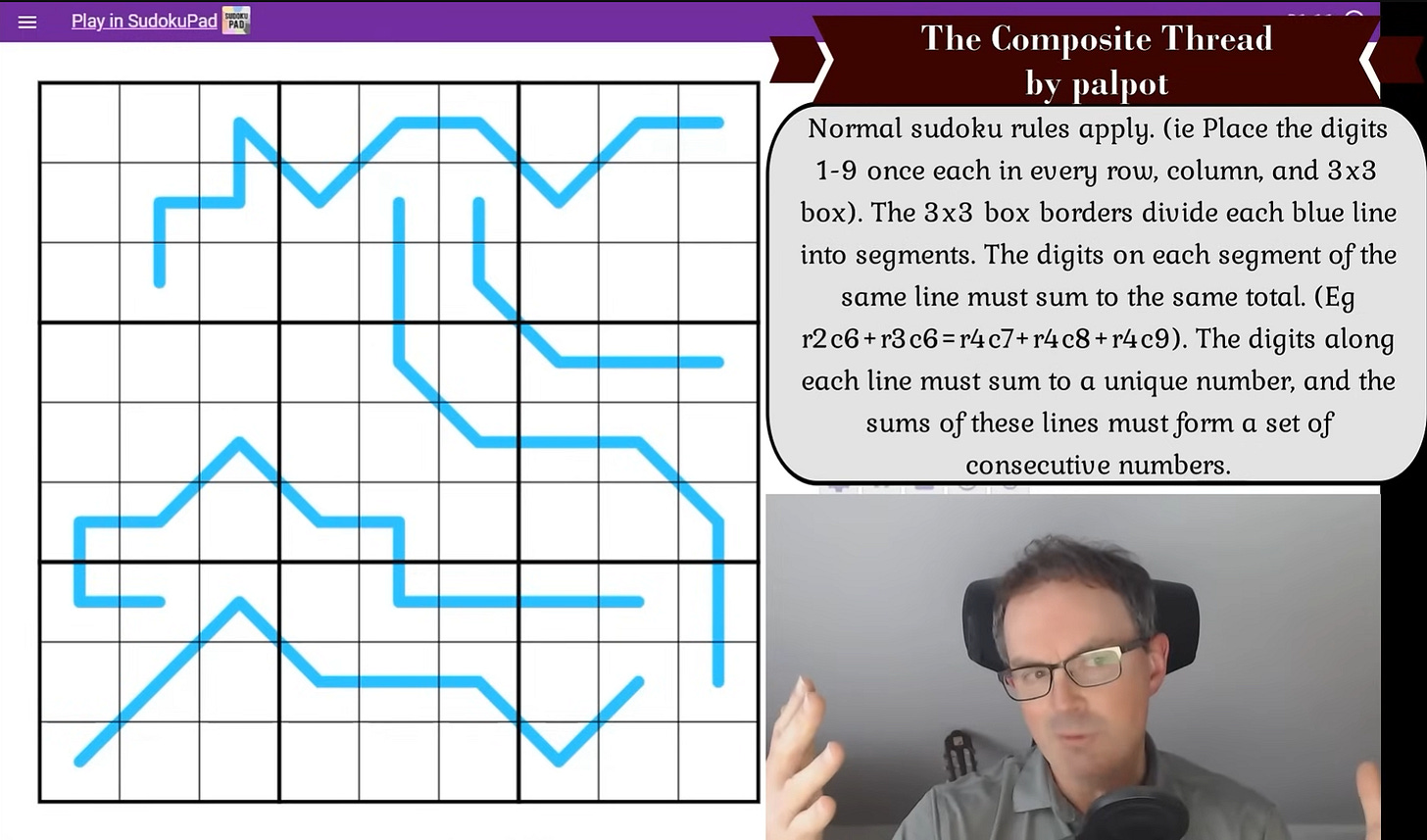 The other day, I watched a very different sort of episode on Cracking the Cryptic. The puzzle was still there, an elegant variant called The Composite Thread by a setter named palpot, but Simon wasn’t solving it himself. Not exactly. Instead, he was testing whether a couple of well-known AI models, Grok 3 and Gemini 2.5, could make sense of it.