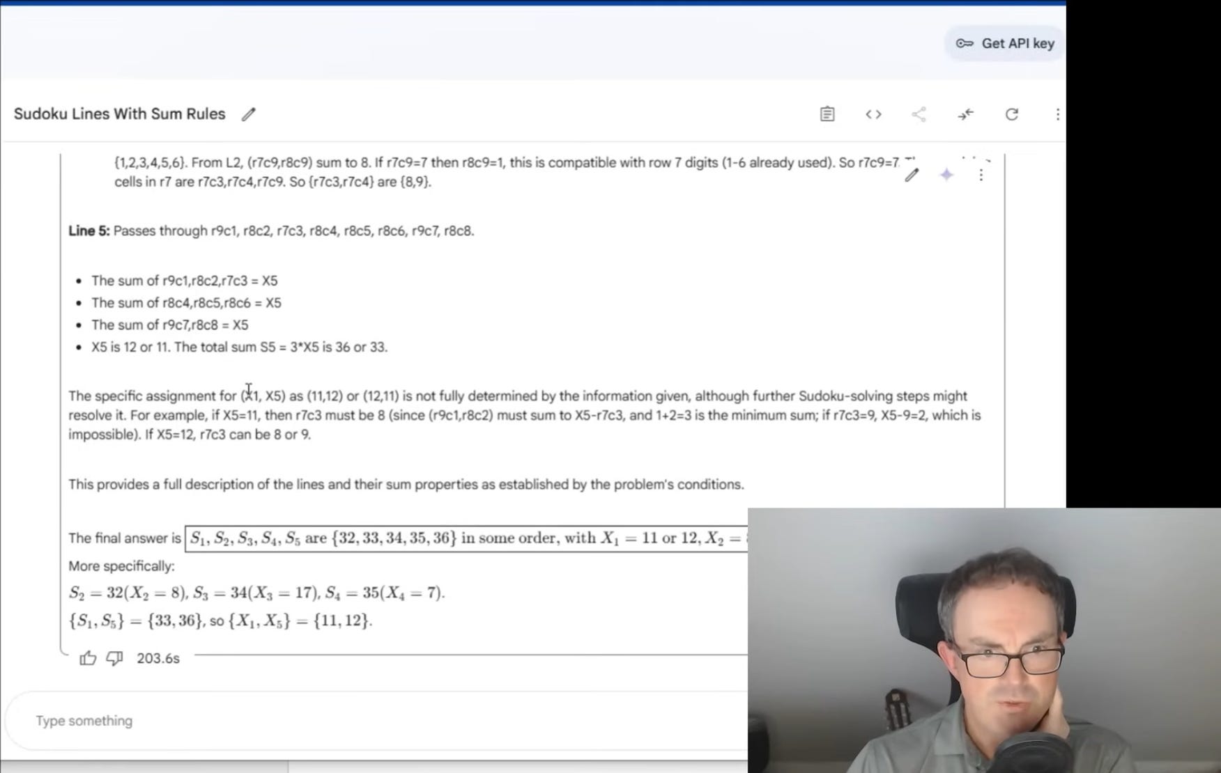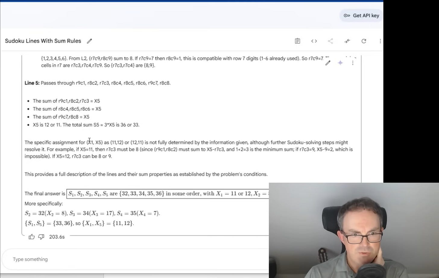 Gemini deduced that certain lines had to be divisible by specific numbers – three, four, five – based solely on the number of segments each contained. It began filtering possible line totals accordingly. It worked out that among any set of five consecutive integers, only one could be divisible by five. It reasoned that a set containing a multiple of five must therefore exclude certain other values. It began to home in on the only possible valid sequence that satisfied all constraints: 32, 33, 34, 35, and 36.